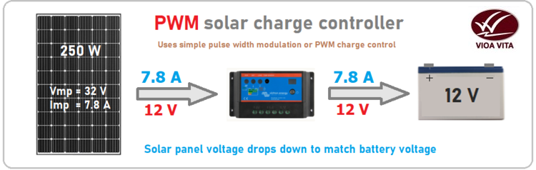 Bộ điều khiển sạc năng lượng mặt trời đơn giản, hoặc điều khiển độ rộng xung có kết nối trực tiếp từ mảng năng lượng mặt trời đến pin và sử dụng một công tắc nhanh cơ bản để điều chỉnh hoặc điều khiển sạc pin. Công tắc (bóng bán dẫn) được mở cho đến khi pin đạt đến điện áp sạc hấp thụ. Sau đó, công tắc bắt đầu mở và đóng nhanh (hàng trăm lần mỗi giây) để giảm dòng điện và duy trì điện áp pin không đổi. Điều này hoạt động tốt, nhưng vấn đề là điện áp bảng mặt trời được kéo xuống để phù hợp với điện áp pin. Điều này lần lượt kéo điện áp bảng ra khỏi điện áp hoạt động tối ưu (Vmp) và giảm hiệu quả. Bộ điều khiển sạc năng lượng mặt trời PWM là một lựa chọn chi phí thấp tuyệt vời cho các hệ thống nhỏ, nơi một bảng điều khiển năng lượng mặt trời duy nhất được sử dụng cho các ứng dụng đơn giản như chiếu sáng mặt trời, cắm trại và những thứ cơ bản như bộ sạc USB / điện thoại.