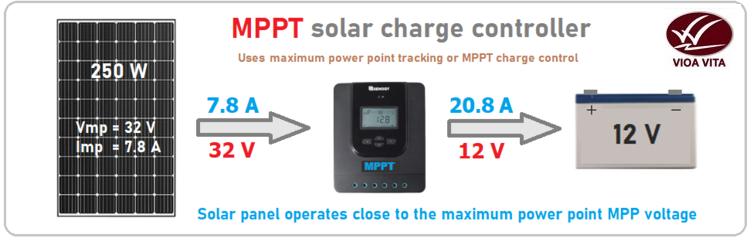 Bộ điều khiển MPPT hoặc 'bộ theo dõi điểm công suất tối đa' tiên tiến hơn nhiều so với bộ điều khiển PWM và cho phép bảng điều khiển năng lượng mặt trời hoạt động ở điện áp tối ưu để có công suất tối đa. Sử dụng công nghệ thông minh này, bộ điều khiển sạc năng lượng mặt trời MPPT có thể hiệu quả hơn tới 30%, tùy thuộc vào điện áp pin và loại pin mặt trời được kết nối. Những lý do để tăng hiệu quả và cách kích thước chính xác bộ điều khiển sạc MPPT được giải thích chi tiết bên dưới. Theo nguyên tắc chung, bộ điều khiển sạc MPPT nên được sử dụng trên tất cả các hệ thống điện cao hơn có từ 2 bảng trở lên hoặc bất cứ khi nào điện áp của bảng cao hơn nhiều so với điện áp pin.